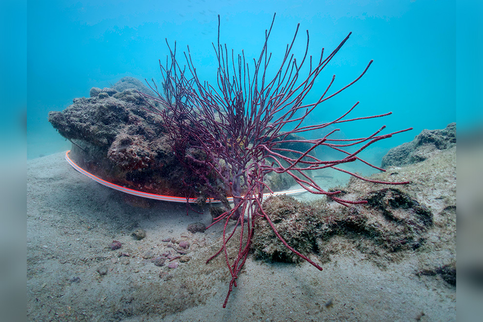 A single line of red-light traces across the coral in several images, symbolising both fragility and boundary.