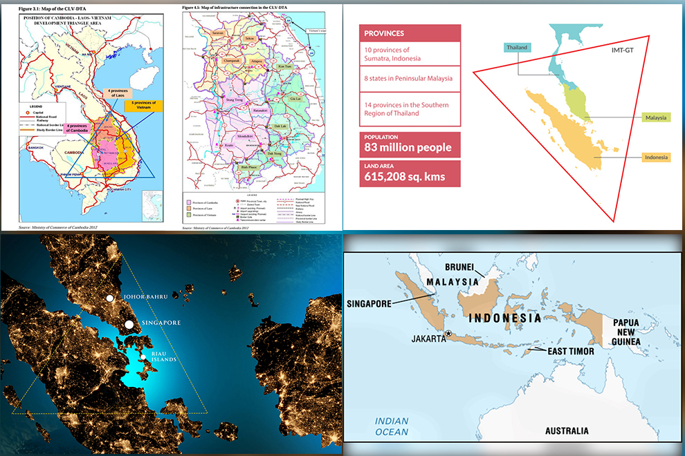 Maps illustrate four similar cross-border cooperation agreements around the region. Clockwise from top-left: The Cambodia-Laos-Vietnam Development Triangle Area (CLV-DTA), the Indonesia-Malaysia-Thailand Growth Triangle (IMT-GT), the Timor-Leste–Indonesia–Australia Growth Triangle (TIA-GT) and the Indonesia-Malaysia-Singapore Growth Triangle (SIJORI). Supplied