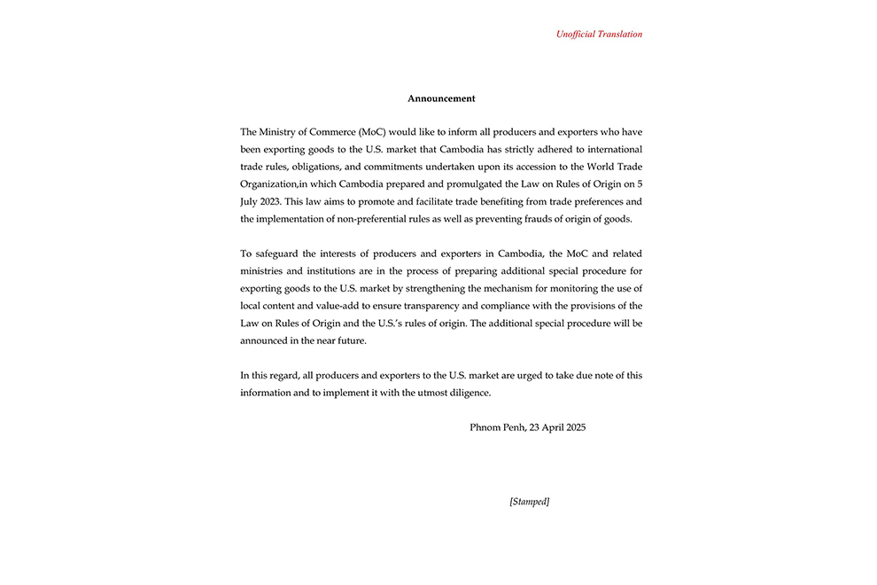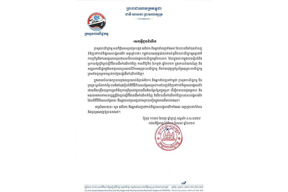 The Ministry of Commerce issued a statement on the evening of April 23, confirming that Cambodia has been and will continue to strictly implement all international trade measures, obligations and commitments made since becoming a member of the World Trade Organization (WTO). Furthermore, the ministry is in the process of organising additional special procedures for exporting goods to US markets.