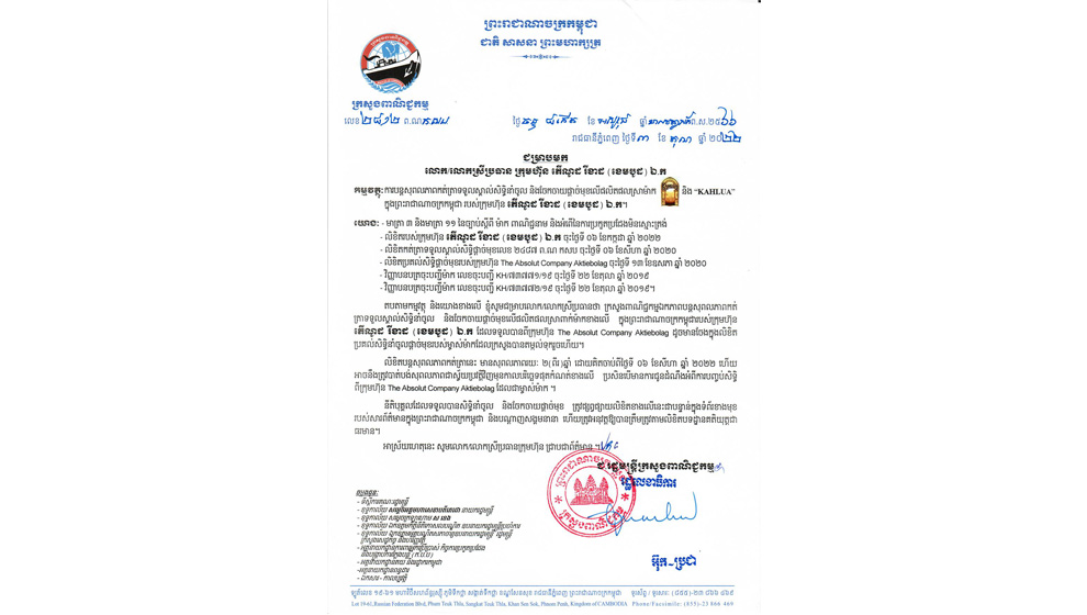 2. Products of spirits bearing trademark “KAHLUA” from The Absolut Company Aktiebolag based on the Authorized Exclusive Distributorship Letter dated 13 May 2020 and Recordal Letter of Extension of Exclusive Right for Import and Distribution No. 2812 dated 03 October 2022 issued by Ministry of Commerce.