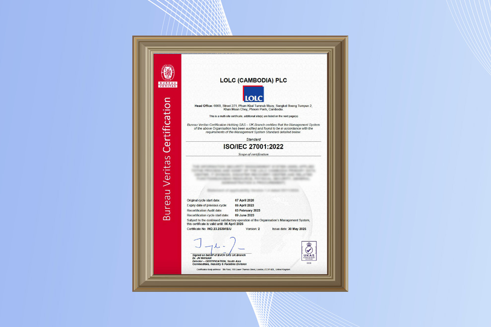 LOLC (Cambodia) Plc., one of the leading microfinance institutions in the country, is pleased to announce that it has successfully upgraded its ISO certification for Information Security Management Systems (ISMS) from ISO/IEC 27001:2013 to the latest ISO/IEC 27001:2022 standard.