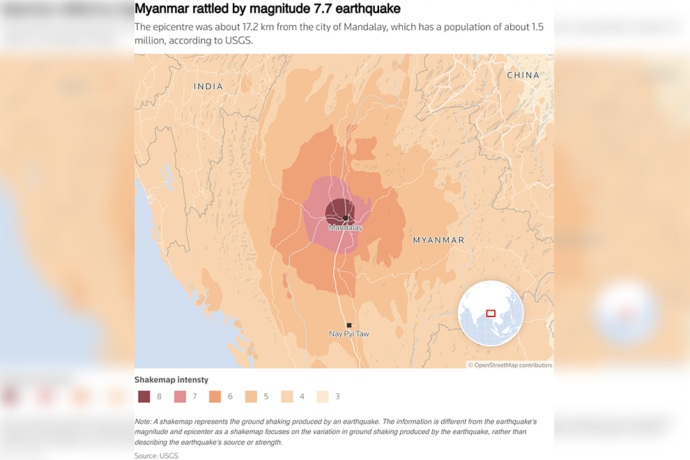 The quake will further stretch Myanmar’s ruling military, which is fighting a civil war against an armed uprising. The junta declared a state of emergency in multiple regions but provided no specifics of damage or injuries.