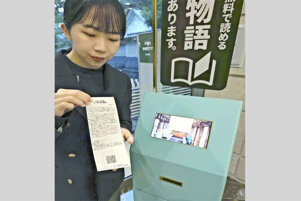 TOKYO – Japan’s first literary vending machine was installed at the Setagaya Literary Museum in Setagaya Ward, Tokyo, this month. When a user touches a button shown on the screen, a story they can be read in a few minutes is randomly dispensed, printed on a long, receipt-like strip of paper. The service is free.