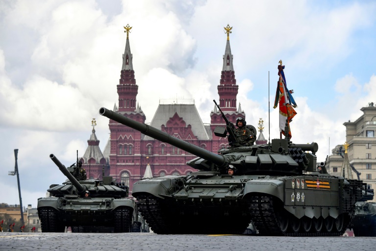 Some 11,000 troops gathered to march on Red Square for Monday’s 77th anniversary, along with more than 130 military vehicles. A planned flypast by Russian military aircraft was cancelled due to bad weather.