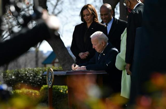 Biden was joined at the Rose Garden ceremony by Vice President Kamala Harris, the first Black woman in the post, and Michelle Duster, the great-granddaughter of pioneering Black journalist and anti-lynching campaigner Ida B. Wells.