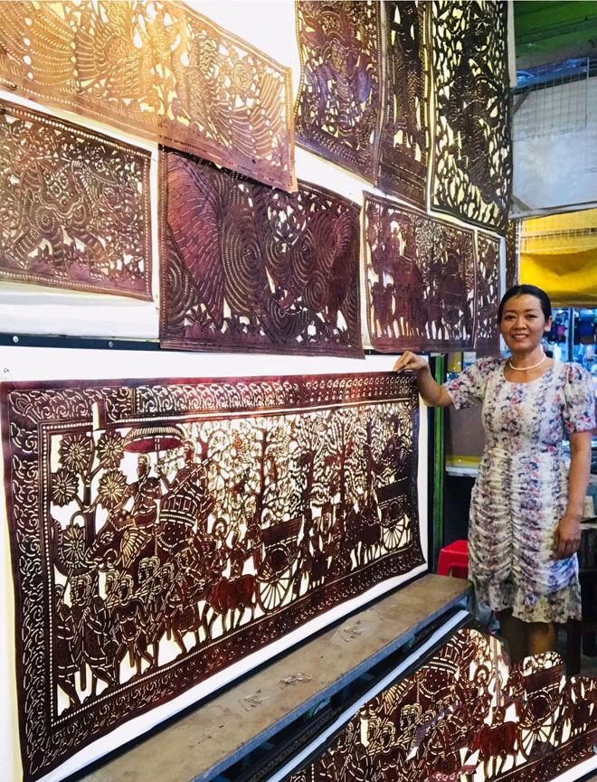 Situated within the Old Market in Siem Reap town, her shop serves as a magnet for both local and international visitors. They are drawn to the allure of crafted cowhide carvings, faithful replicas inspired by the designs found on the temple walls. The pricing of these pieces reflects their diversity in size, ranging from $10 to over $1,000.