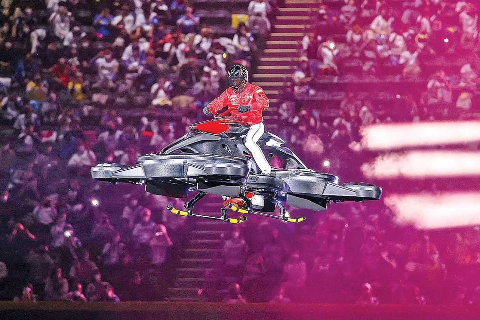 His extravagant outfits and jaw-dropping stunts are headline news in Japan, but now larger-than-life baseball manager Tsuyoshi Shinjo has upped the theatrical ante by entering the stadium on a hover-bike.