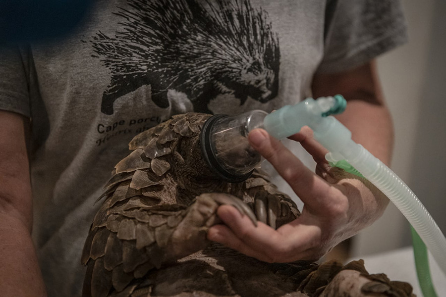 The hospital room is air-cooled to feel like a pangolin’s burrow. The patient, Lumbi, is syringe-fed with a protein-packed smoothie, given a daily dose of medicine and has his vital signs checked.