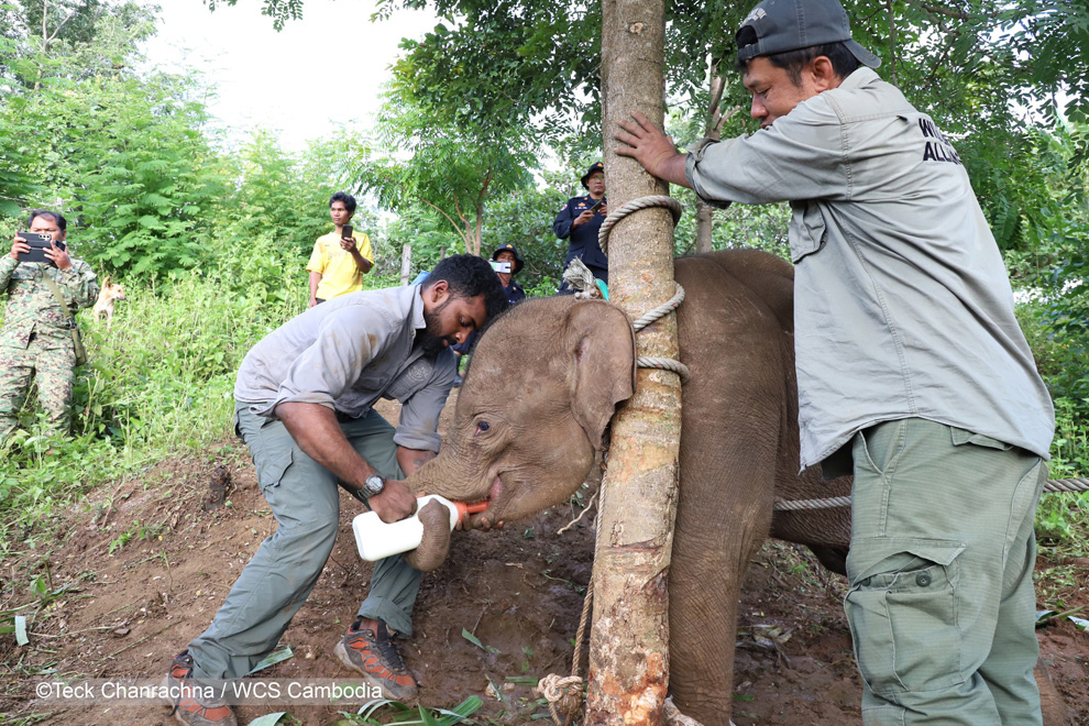 “[She] looked thin due to a lack of nutrition from her mother’s milk,” said a WCS statement, adding that while waiting to see if the elephant herd would return to the calf, WCS partnered with WWF-Cambodia and the Wildlife Alliance to provide food and milk and stop her growing weaker.