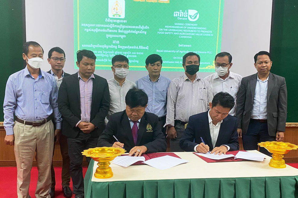 The Royal University of Agriculture (RUA) signed a memorandum of understanding (MoU) with Develop Agriculture Value Chain Network for Economic and Environment (Davane), with a focus on food safety research and analysis of food insecurity in the Kingdom.
