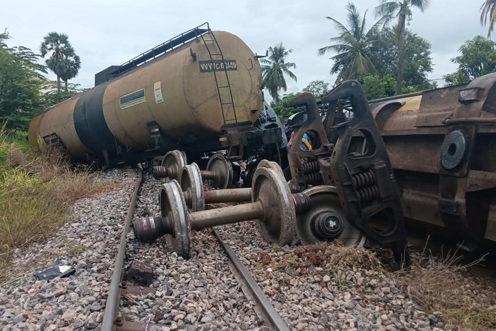 Phorn Rim, spokesman for the Ministry of Public Works and Transport, said the derailment was caused by a collapsed railway track, resulting in four tankers overturning. Three of the overturned tankers leaked fuel, while 70 meters of track were damaged. No injuries were reported.
