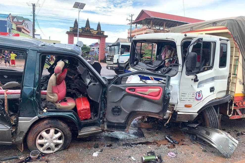 A local media outlet cited an official police statement as saying that the container truck, which was bound from Preah Sihanouk to Phnom Penh, attempted to overtake another truck and collided head-on with the van.