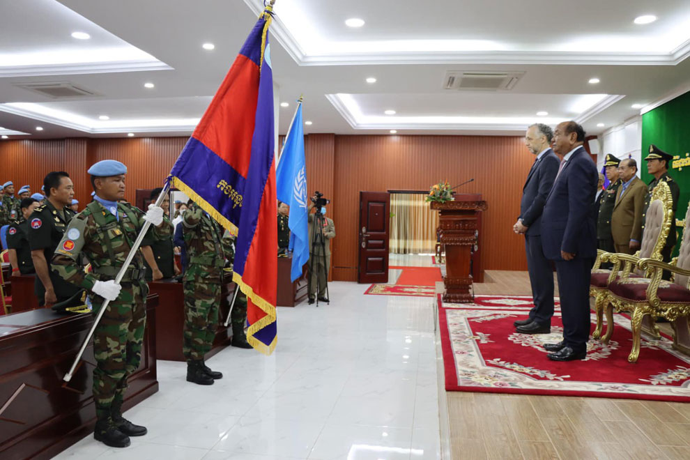 Pol Saroeun, Senior Minister in Charge of Sending Troops to UN Peacekeeping Missions, presided over a send-off ceremony for Engineering Unit 423 that morning in the capital, the NPMEC said in a statement, noting that UN resident coordinator in Cambodia Joseph Scheuer and the centre’s director-general Sem Sovanny were also present at the event.