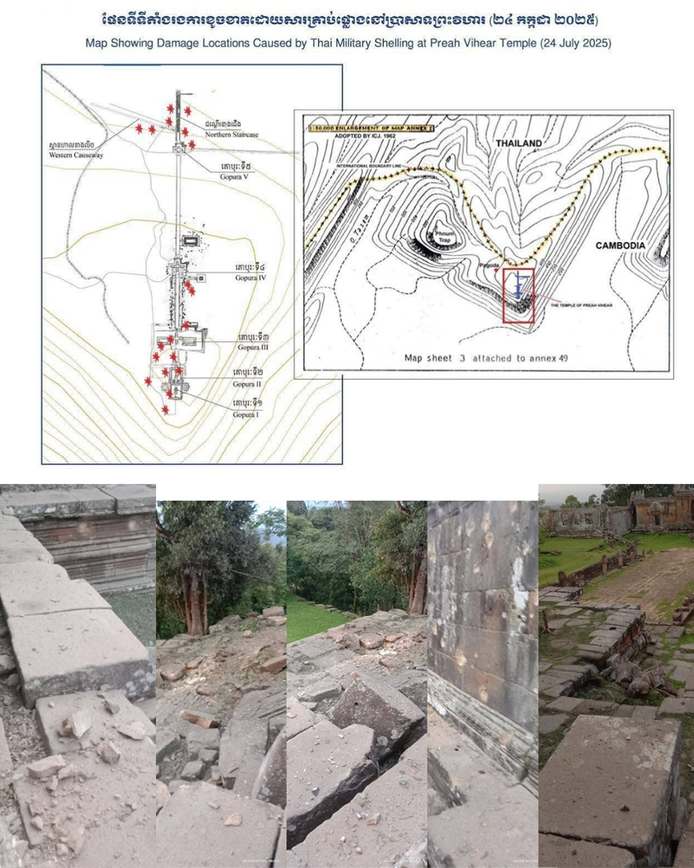 Minister of Culture and Fine Arts Phoeurng Sackona presented evidence of the damage caused to parts of the Preah Vihear Temple by artillery shelling and bombing by Thai F-16 fighter jets on July 24. She called for urgent measures to prevent further damage.