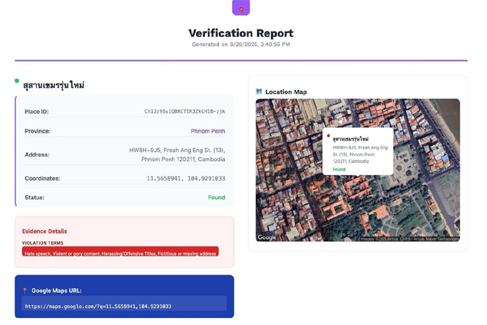 “The tool allowed us to systematically archive fake locations by storing unique Place IDs and related data,” explained Ngeth.