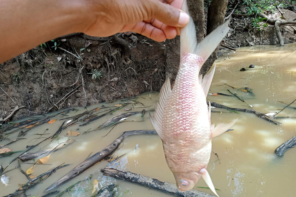 Most of the dead fish – in a fish breeding conservation area – were Khman (Hampala dispars), sailfin shark carp (Morulius chrysophekadion), grum fish (Osteochilus melanopleurus) and giant barbs (Cyclocheilichthys enoplos). Some individual fish weighed up to 5kg.