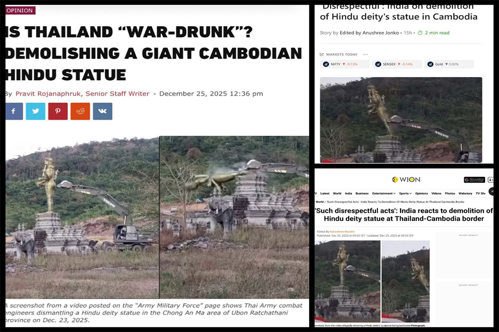 Since December 24, Indian media outlets have extensively reported on the demolition of the Hindu deity statue, which was built in 2014 on Cambodian land near the Thailand–Cambodia border.