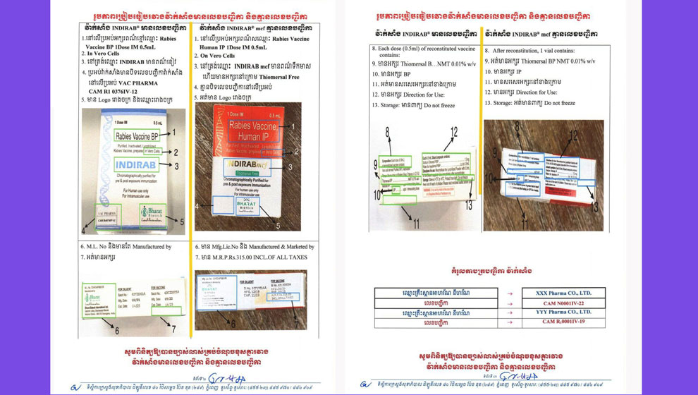 The INDIRAB vaccine distributed by VAC PHARMA Co Ltd has the registration number CAM R, 0376 IV-12 and comes in white and blue packaging, while the unregistered version has a cheap-looking red and white packet featuring a number of errors.