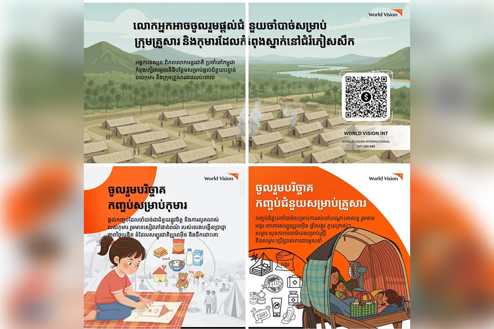 World Vision Cambodia, an international humanitarian organisation focused on child welfare, has appealed for support to help save lives and stand with displaced families in Preah Vihear, Oddar Meanchey and Banteay Meanchey provinces, all of which are severely affected by the ongoing Cambodia–Thailand border crisis.
