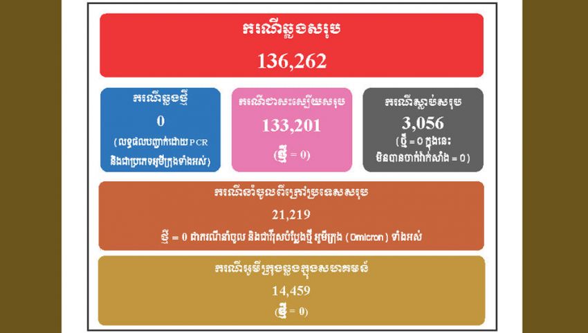 Share Facebook Twitter LinkedIn Pinterest Email The Ministry of Health on May 24 reported zero new Covid-19 cases and no new deaths. As of May 24, Cambodia had recorded a total of 136,262 Covid-19 cases with 133,201 recoveries and 3,056 fatalities. National Phnom Penh Post Post Staff