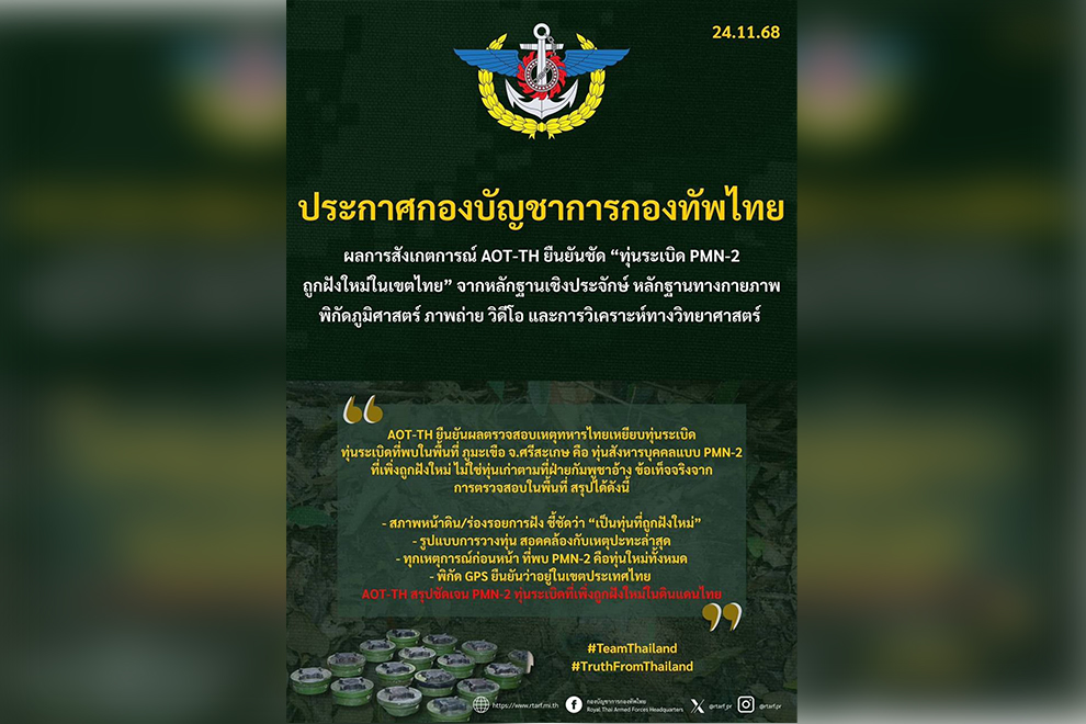 The Thai army suggested that their claims were based on reporting from the ASEAN observer team (AOT) stationed in Thailand, which alleged that the mine which exploded on November 10 was a PMN-2 type that had been newly placed.