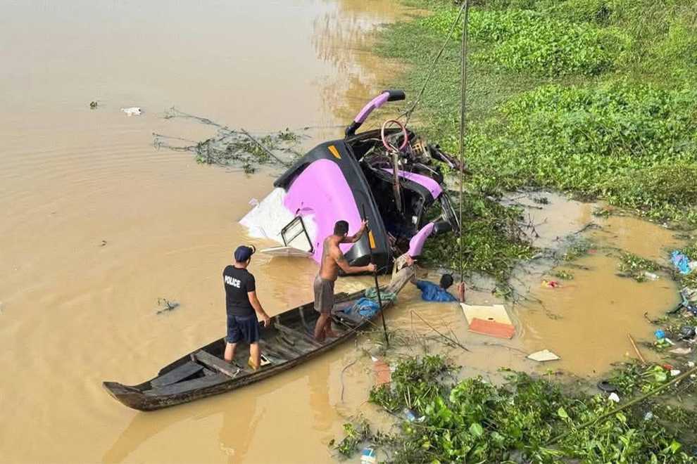 The double-decker bus was travelling from Oddar Meanchey to Phnom Penh, via Siem Reap, when it plunged of the O’ Prasat bridge in Kakoh commune, Santuk district, in Kampong Thom province, at around 3.20am this morning, November 20. The bus, carrying 37 passengers, hit the head of the bridge and fell into the water, causing 13 deaths and injuring 24 others, 14 of them seriously.
