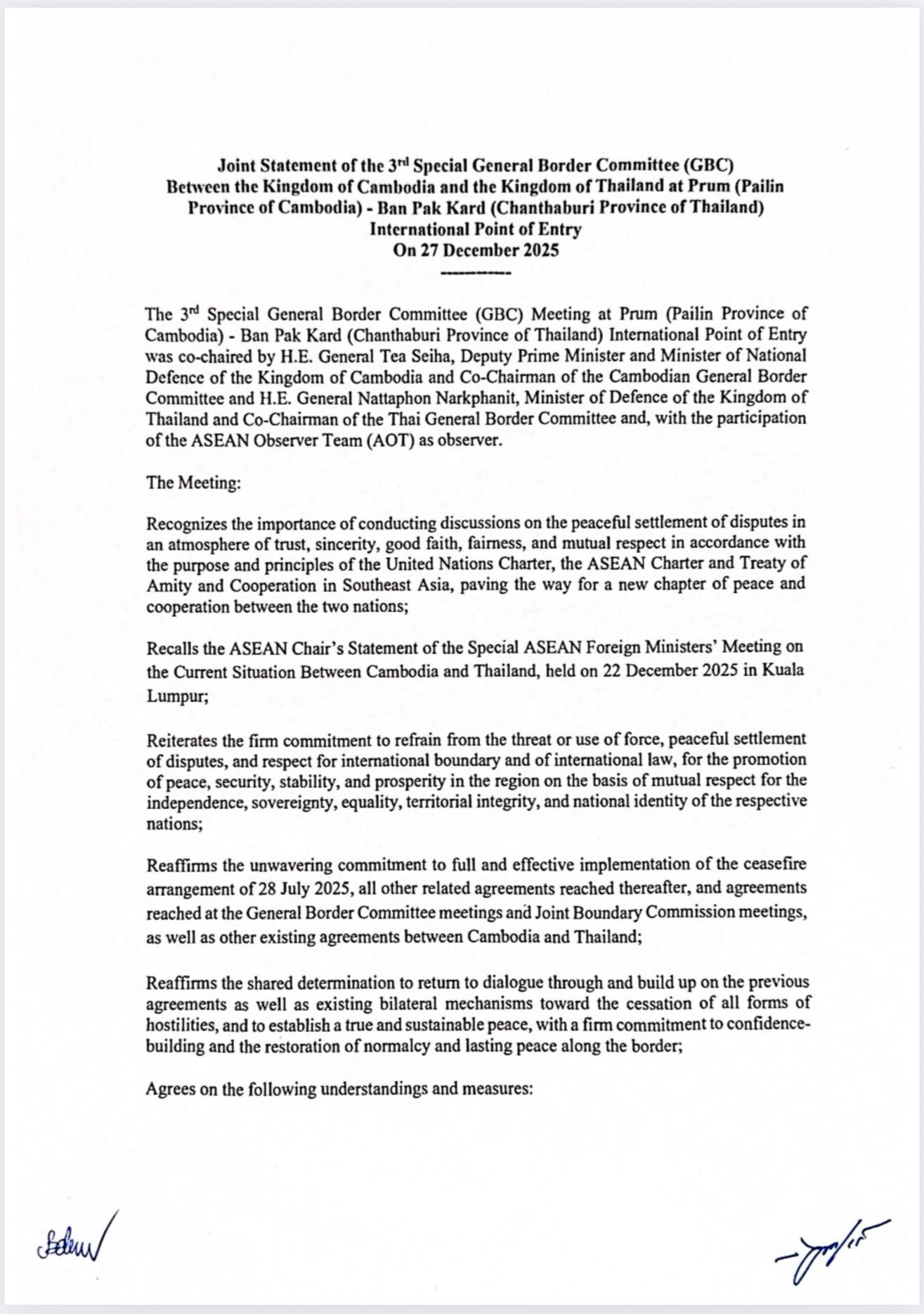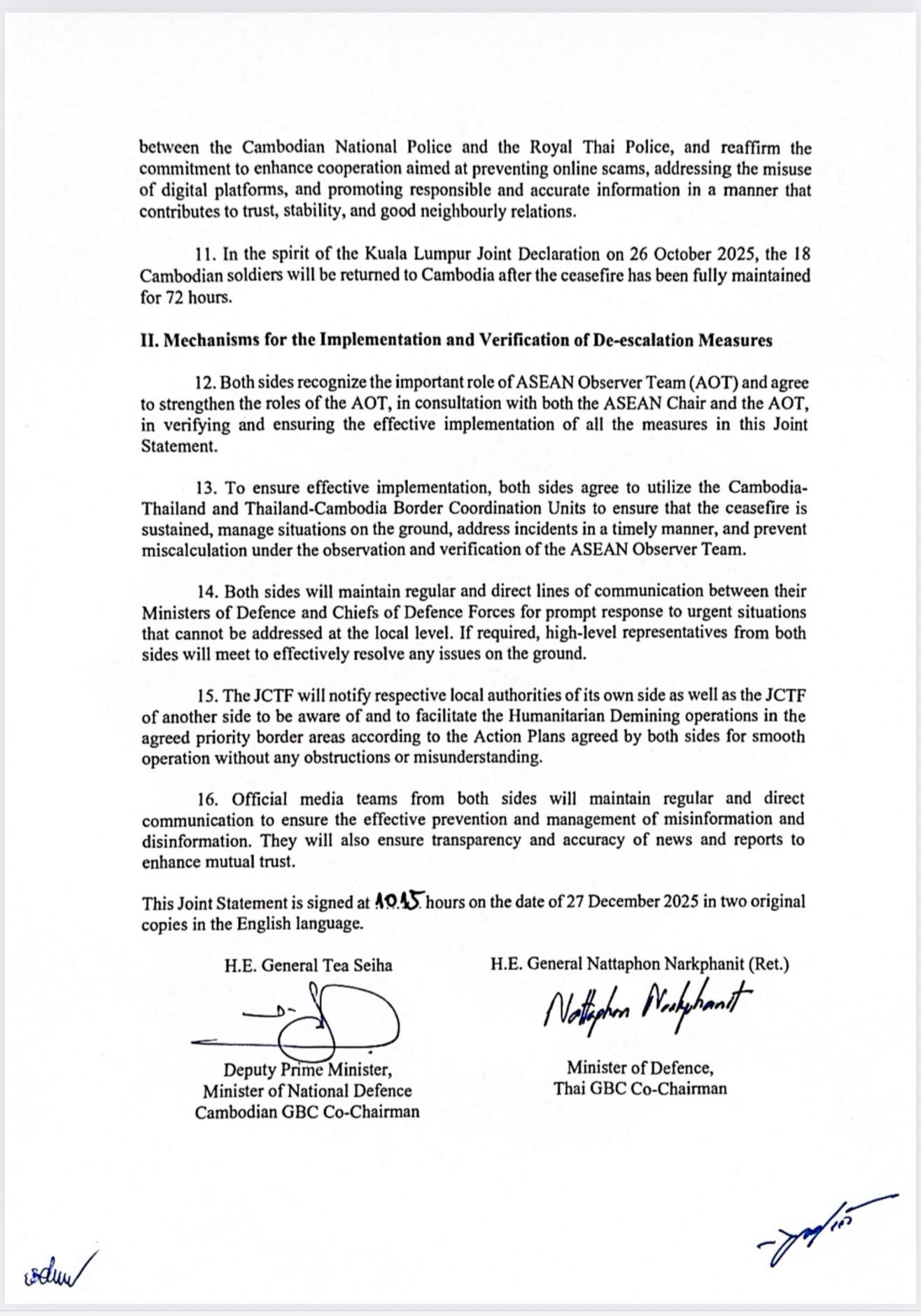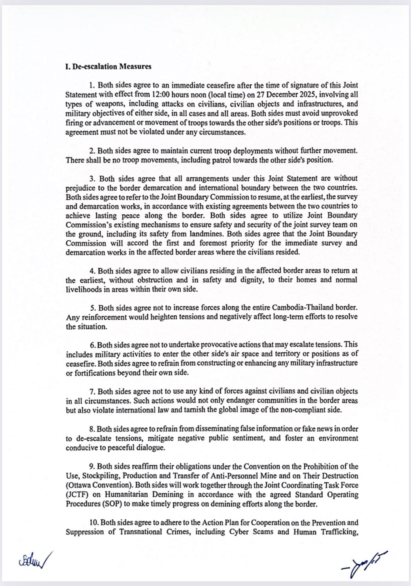 Cambodia and Thailand have agreed to an immediate ceasefire, effective from noon today, December 27, involving all types of weapons, including attacks on civilians, civilian objects and infrastructures, and military objectives of either side, in all cases and all areas.