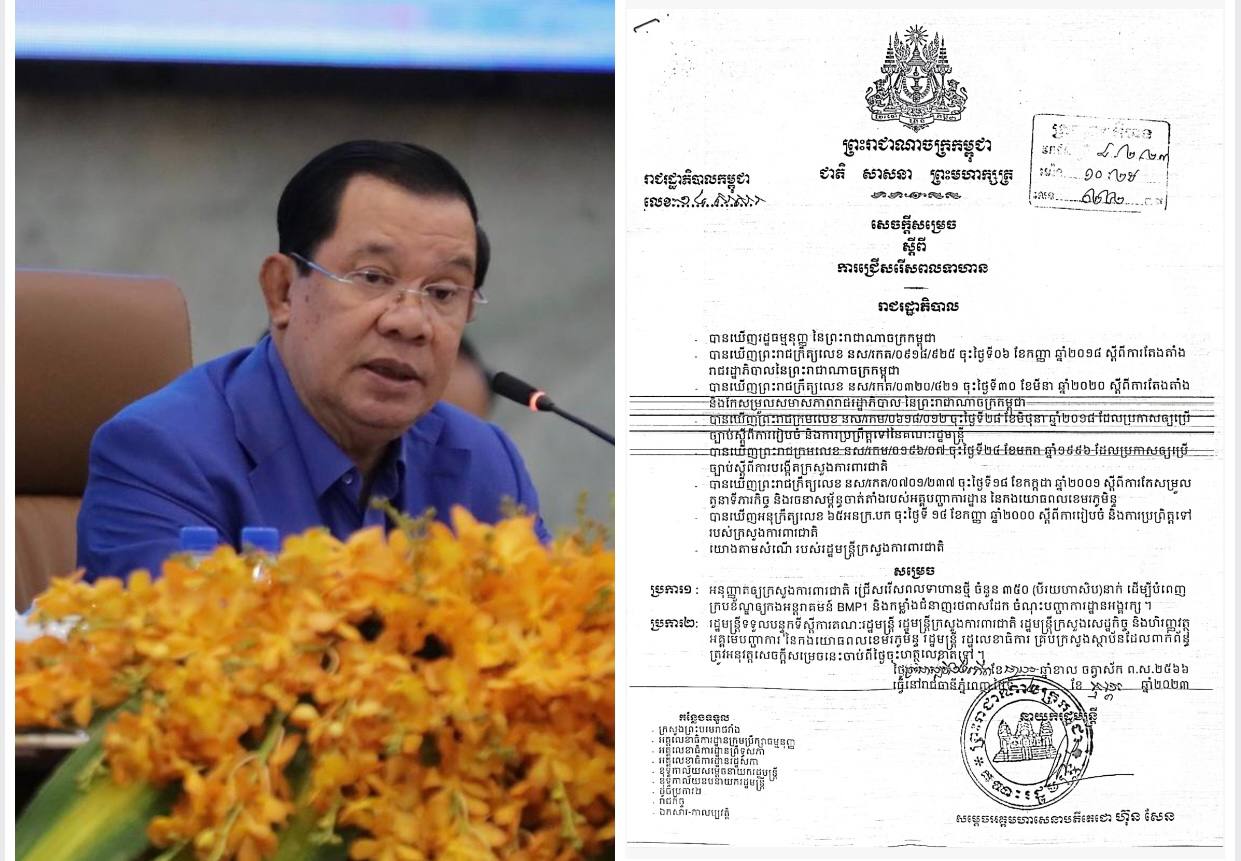 Prime Minister Hun Sen on February 10 signed a directive authorising the Ministry of National Defence to recruit 350 military personnel to “fulfil the framework” of a “BMP1” intervention force and an armoured unit under the Bodyguard Command, at the request of Defence Minister Tea Banh.
