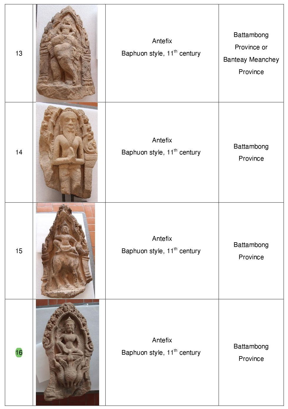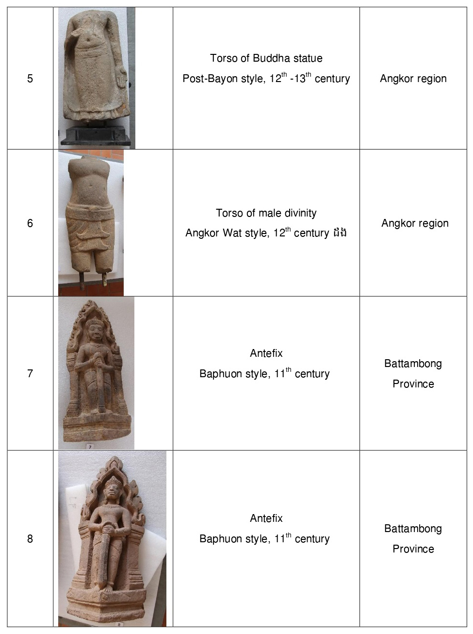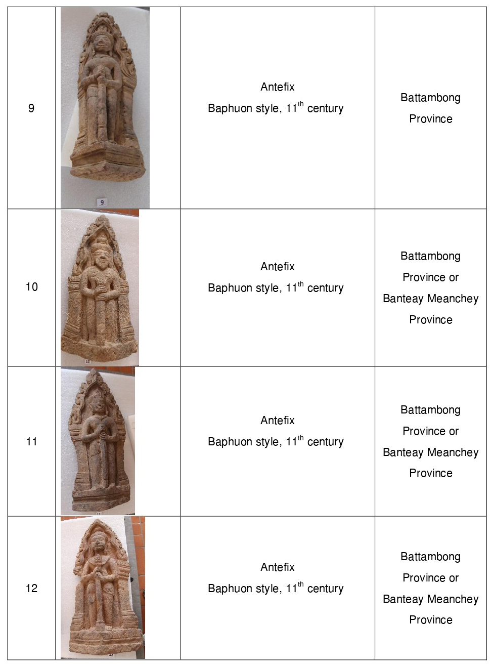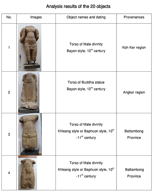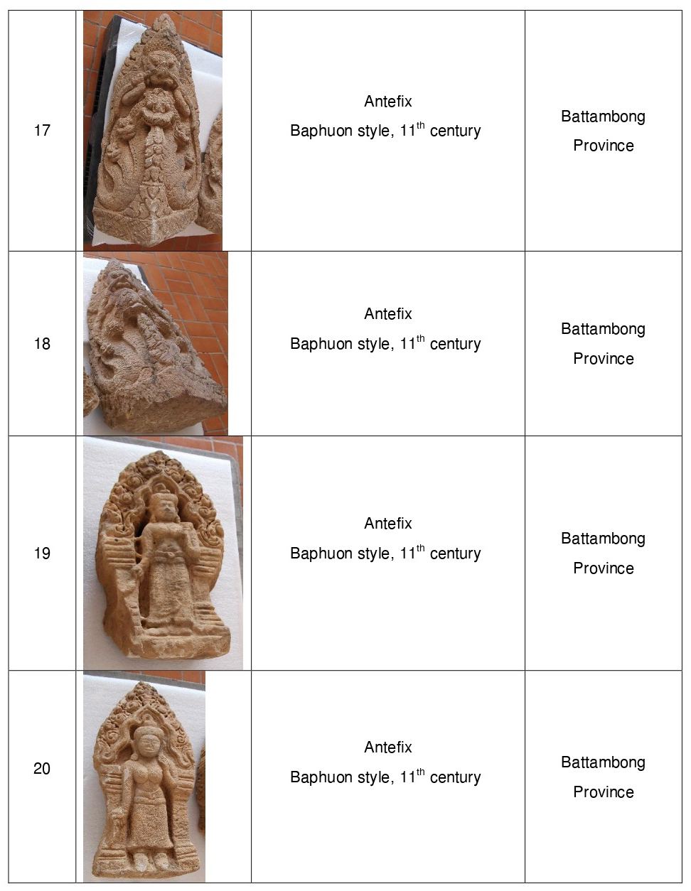 Most of the 20 artefacts were crafted in the 11th century, while some date from the 12th and 13th centuries. The majority originate from Battambang and Banteay Meanchey provinces, while some come from temples in the Angkor region or Koh Ker Temple.