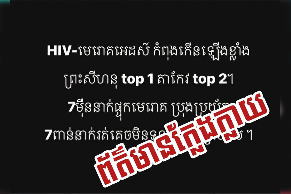 A recent post by the Facebook account “Hea Ra” claimed that HIV/AIDS cases are surging in Cambodia, particularly in Preah Sihanouk and Takeo provinces. The post suggested that the two provinces are home to some 70,000 people living with HIV, with 7,000 evading treatment, while in truth, the quoted figures are close to the totals listed by health officials for the entire Kingdom.