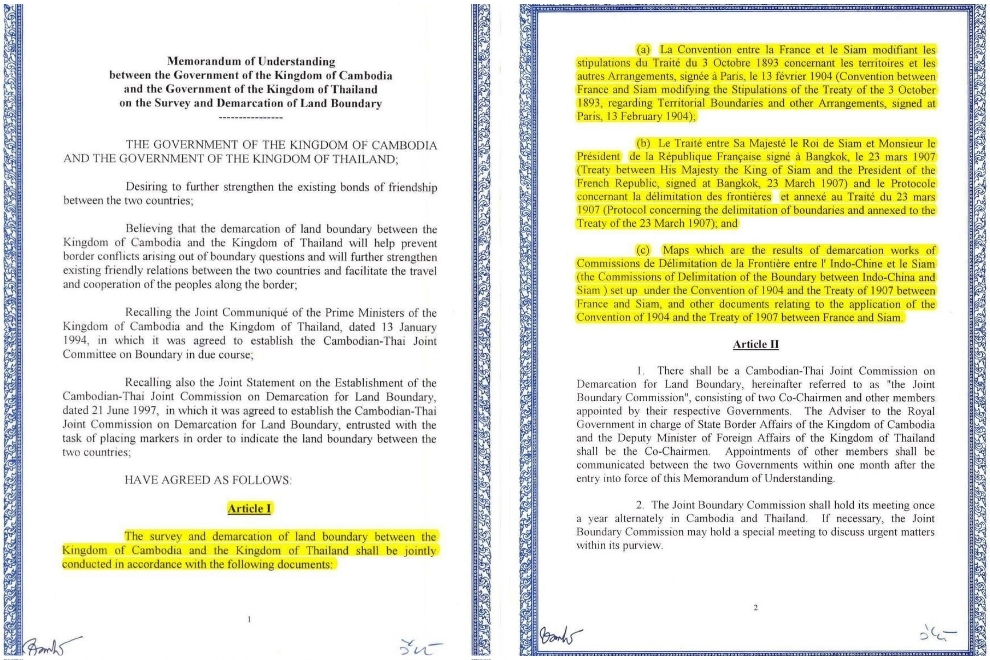 On June 14, 2000, the Royal Government of Cambodia and the Royal Government of Thailand took a significant step toward peace and cooperation by signing the Memorandum of Understanding on the Survey and Demarcation Work of Land Boundary. Far from a vague political gesture, the agreement is an official treaty instrument drafted in three languages, — Khmer, Thai and English — and formally deposited with the Secretariat-General of the UN, making it not only bilaterally binding but internationally recognised.