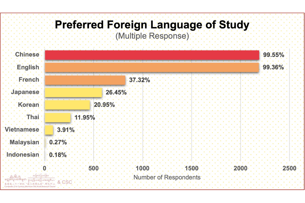 For Cambodian youth, language is more than a means of communication — it’s a strategic asset. Nearly all respondents (99.55%) view Chinese as the most promising language for career advancement, closely followed by English (99.36%). This dual focus reflects the realities of a globalised world. English remains the lingua franca of international business and technology, while Chinese has surged in importance due to China’s economic rise and its deepening ties with Cambodia through initiatives like the Belt and Road Initiative (BRI).
