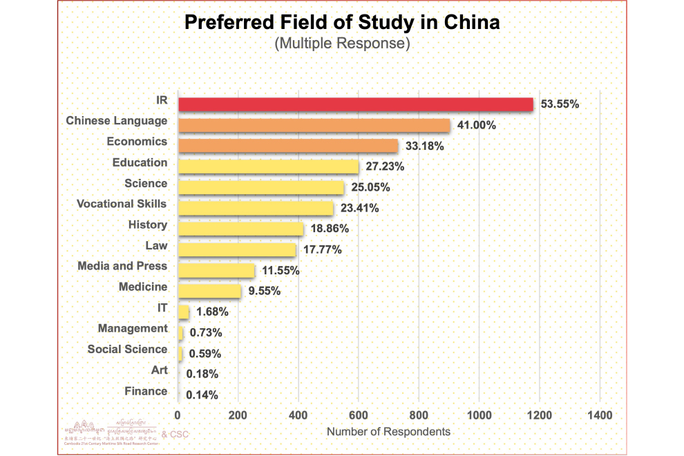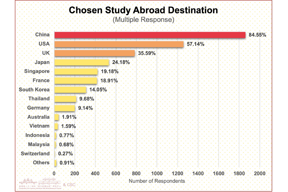 When it comes to higher education, China stands out as the top choice for Cambodian youth, with 84.55% of respondents expressing a desire to study there. This preference is driven by several factors. First, China offers a wide range of scholarships that make higher education more accessible to students from developing countries. Second, Chinese universities are increasingly recognised for their academic excellence, particularly in fields like international relations, economics and education — areas that align closely with Cambodia’s development priorities.