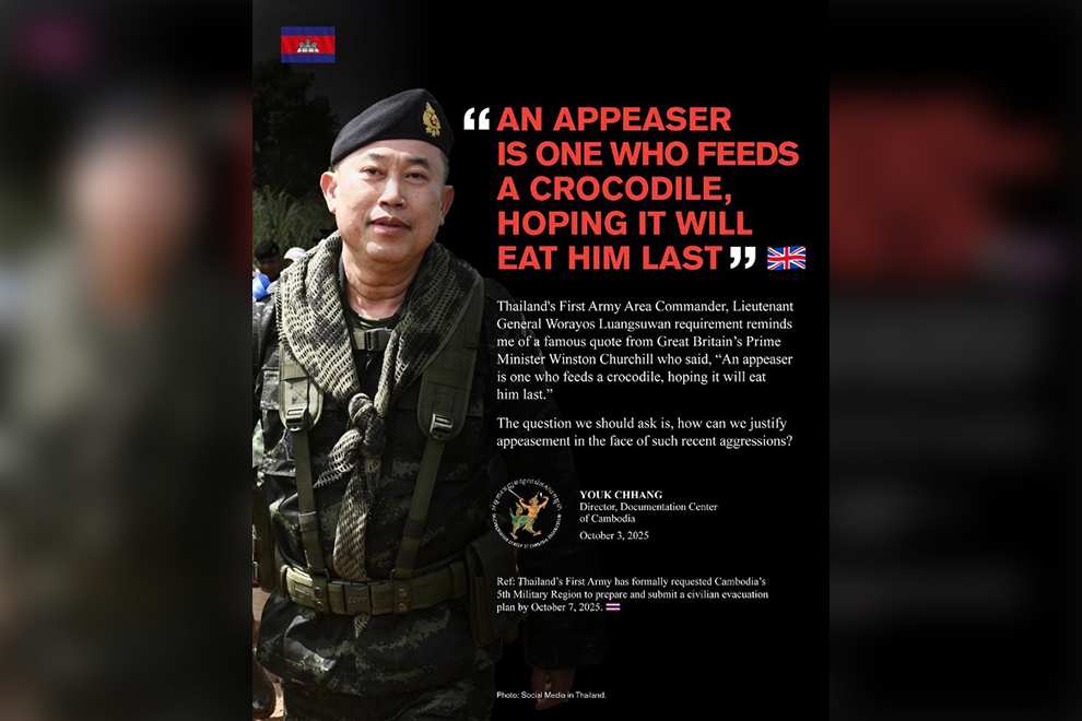 Last week, Worayos Luangsuwan, the newly appointed commander of Thailand’s First Army Region, instructed Cambodia’s Military Region 5 to prepare an evacuation plan for the Cambodian citizens of Prey Chan and Chouk Chey villages, and submit it to Thailand by October 7.