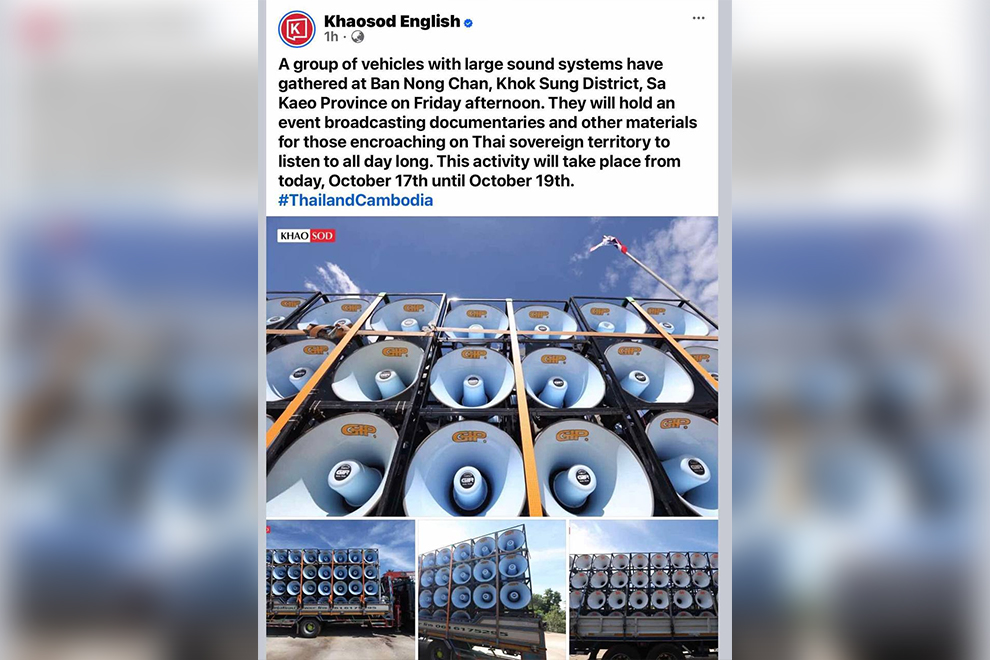 “A group of vehicles with large sound systems gathered at Ban Nong Chan, Khok Sung District, Sa Kaeo Province, on Friday afternoon. They will hold an event broadcasting documentaries and other materials for those encroaching on Thai sovereign territory to listen to all day long. This activity will take place from October 17th until October 19th.”