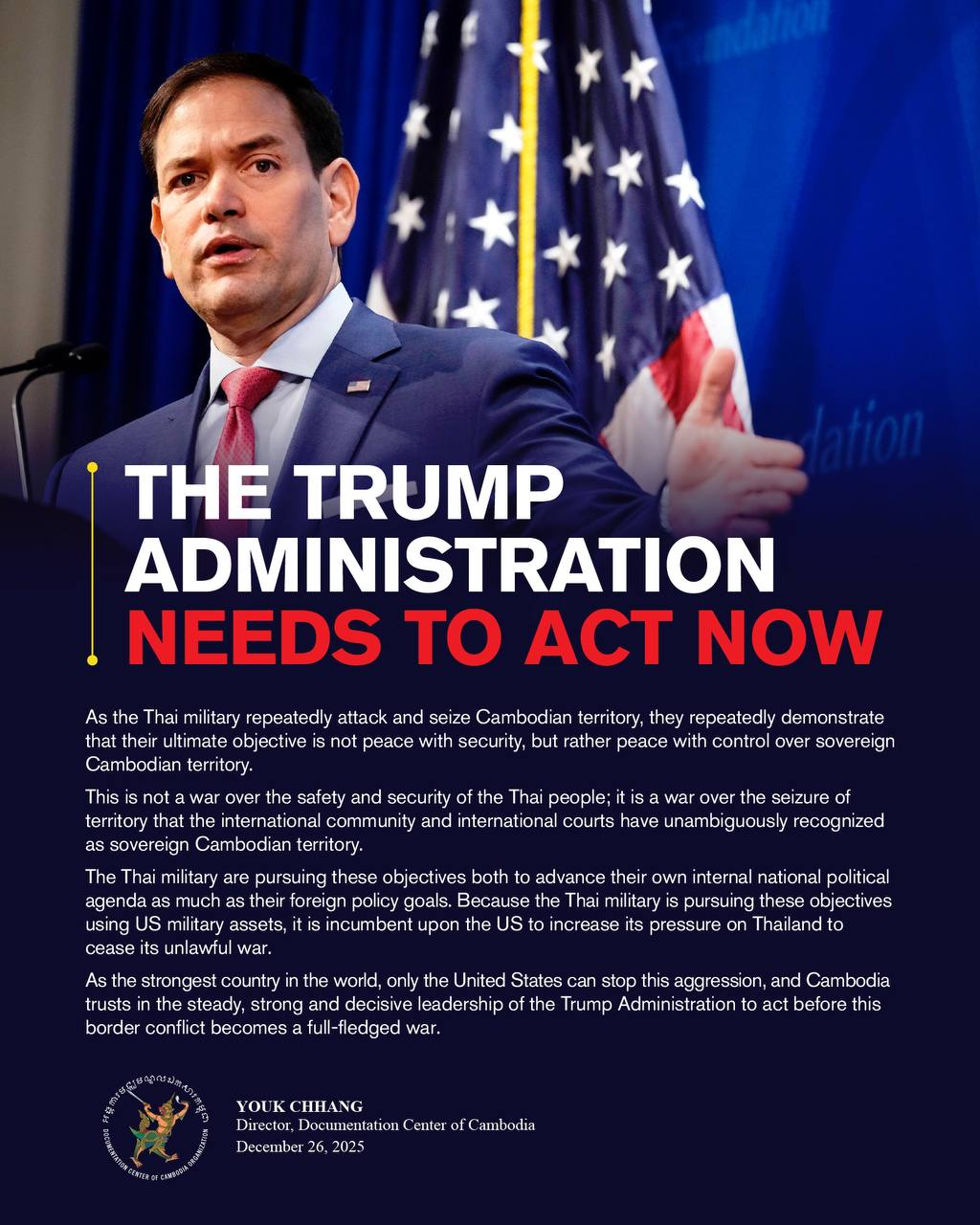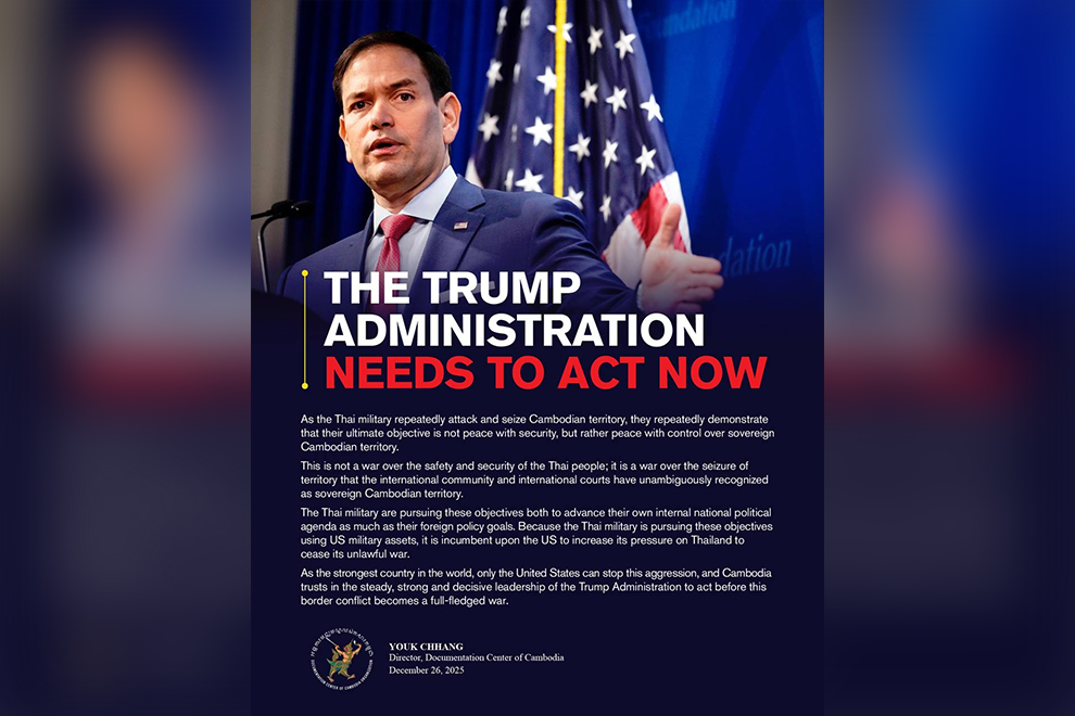 As the strongest country in the world, only the US can stop this aggression. Cambodia trusts in the steady, strong and decisive leadership of the Trump administration to act before this border conflict becomes a full-fledged war.