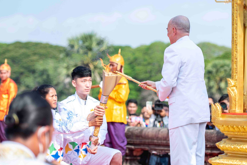 King Norodom Sihamoni lit the SEA Games torch at Angkor Wat temple on the morning of March 21, marking the kickoff of the relay of the 32nd SEA Games torch, timed to coincide with the Angkor Wat equinox.